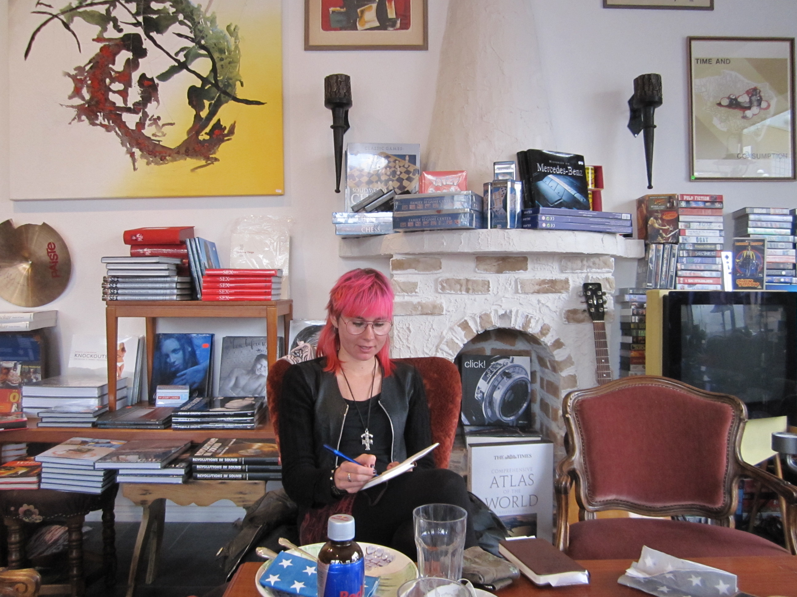 Pennorna rusade över pappret, de flesta ville läsa upp sina texter och dessutom spexa till det med yvigt scenspråk. Vi provade att läsa dikter med och utan inlevelse, med hög och låg röst, med och utan pauser. Innan jag visste ordet av hade vi dragit över tiden eftersom det blev så många intressanta diskussioner. Bland annat om att skriva på engelska.