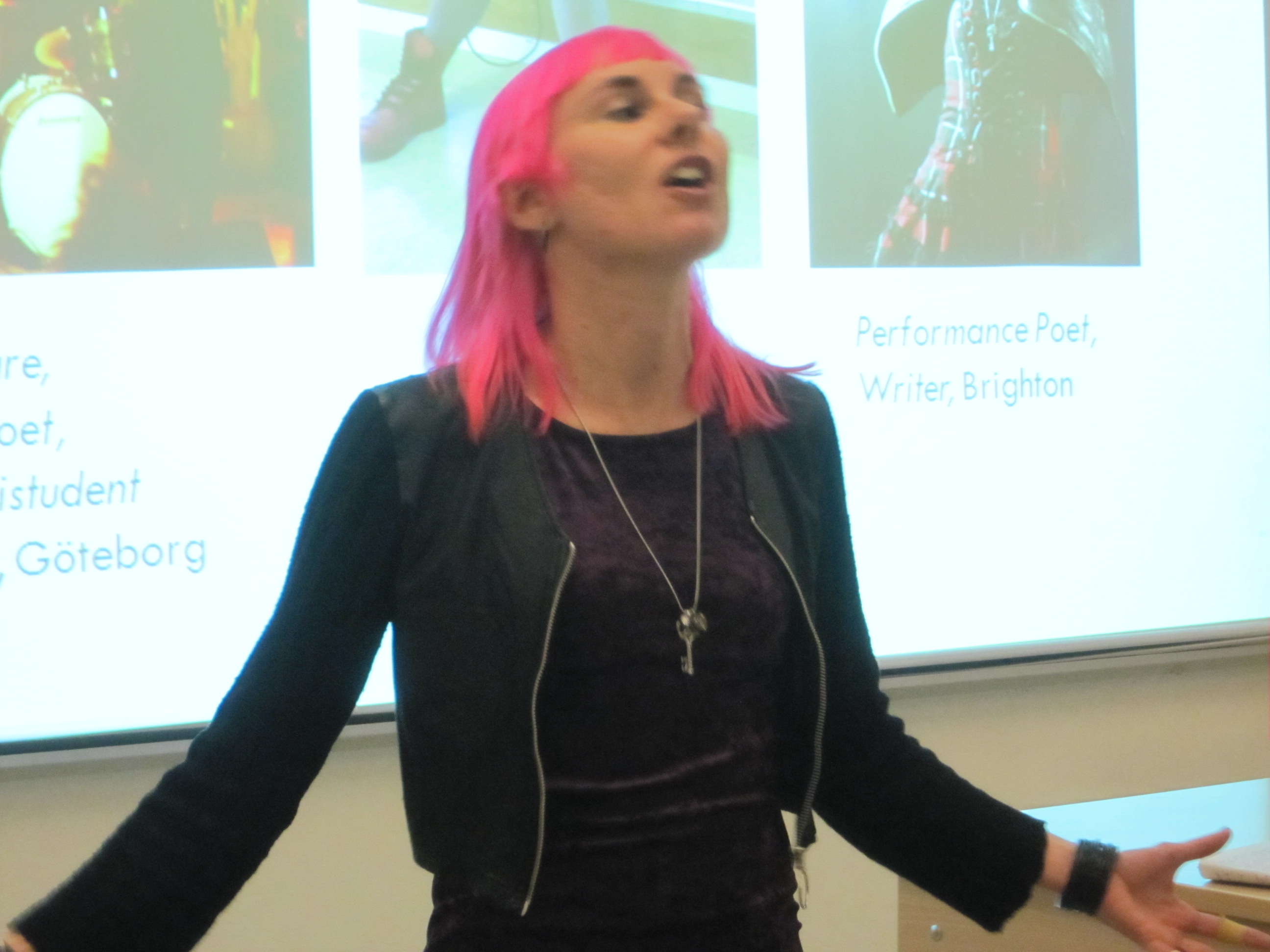 Jag började med att vara mig själv. Louise som bor i Göteborg och tävlar i Poetry Slam. Jag framförde ett par dikter, bland annat Nej! som handlar om min ilska över rättsosäkerheten i våldtäktsfall och jag pratade även om olika typer av dikter och om hur ett Poetry Slam går till.