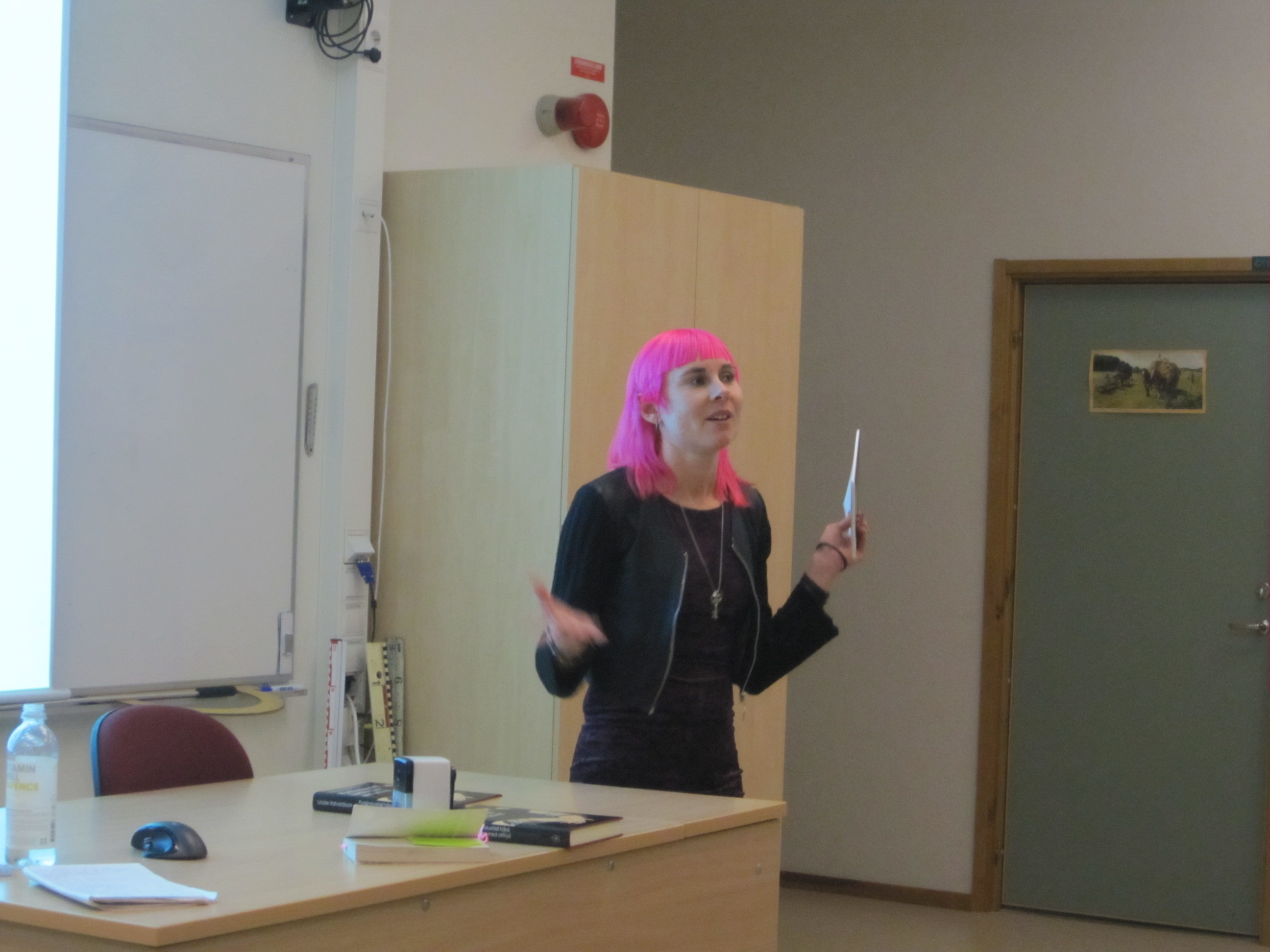 Jag är glad att det funkade att göra en föreställning istället för en föreläsning och lärarna sa att mycket av det jag pratade om skulle de ta upp i undervisningen. Mina retoriska knep till exempel. Knep jag inte var medveten om att jag hade … (Det var verkligen inte meningen att skära mig på papper precis innan jag började prata om ”sår” och ”plåster” som metaforer för att skriva om jobbiga och bra saker!)