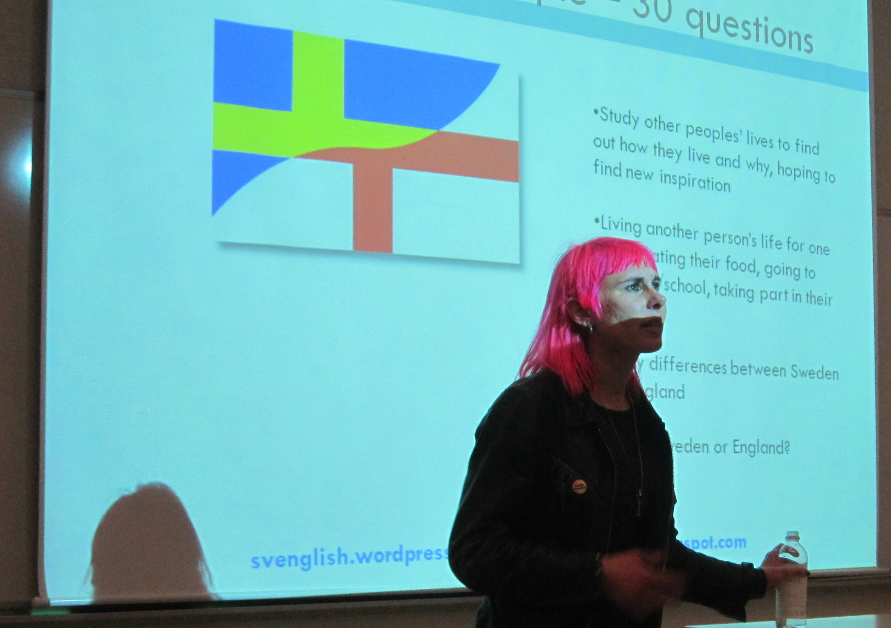 Hon spände blicken i eleverna och försökte lura i dem att hon var från Brighton, England, men erkände ganska snart att hon trots allt var svensk. Och att hon nu bodde i Sverige på grund av en 30-årskris, en 30-årskris som resulterade i Svenglish-projektet.