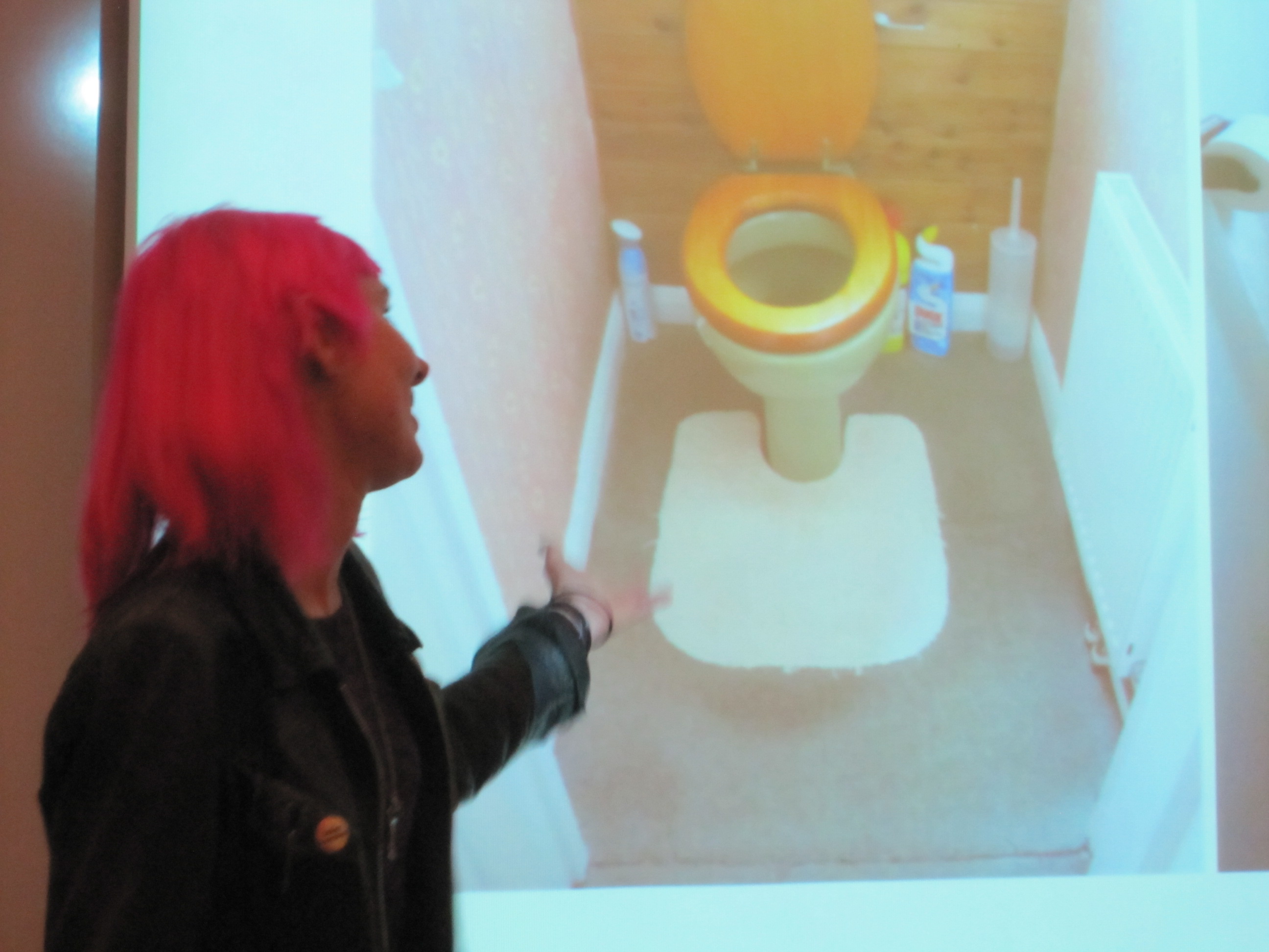 Så det var ganska passande att hon pratade om engelska toaletter. Om myten att alla engelska hem har heltäckningsmatta i badrummet. När hon gjorde sitt svengelska projekt var det ingen av de femton engelska deltagarna som hade heltäckningsmatta på toan. (Däremot har hon tidigare bott i flera hus där heltäckningsmatta funnits.)