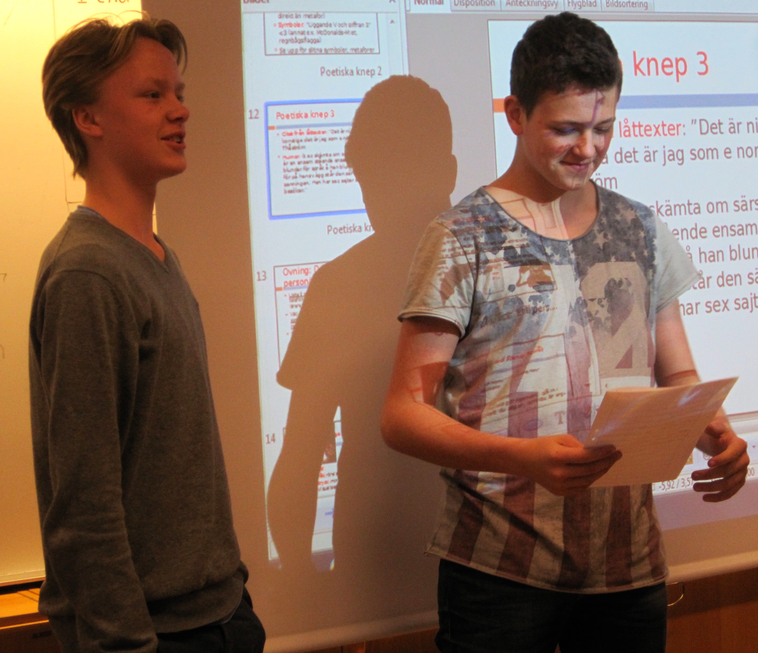 Det är mycket jag lär mig själv genom att vara ute på skolor. Facebook är gammaldags. Nu är det Snapchat som gäller. Därför gick min dikt om Facebook inte riktigt hem hos alla. Jag fick också lära mig att inte förlita mig på PowerPoint-presentationer. Mitt program kunde inte öppnas på skolans datorer. Men det gick bra ändå. Jag blir bättre och bättre på att improvisera. Och ha kul. För det verkade eleverna ha när de låg på bänkarna och skrev dikter till varandra och till tomten.