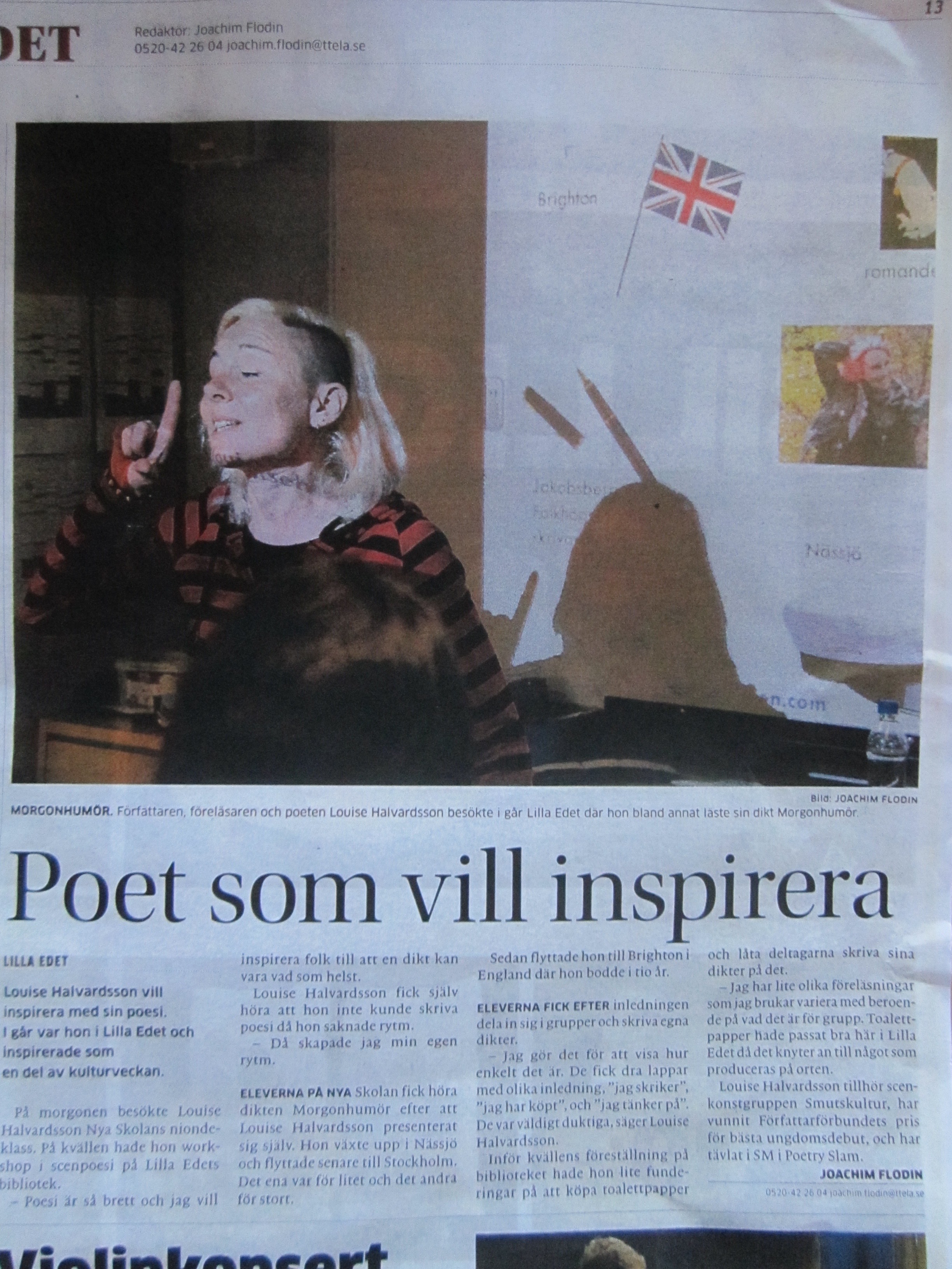 TTELA (Trollhättans tidning-Elfsborgs län allehanda) skriver om mitt författarbesök med poesi-workshops i Lilla Edet förra veckan. Jag är även omnämnd på Lilla Edet kommuns hemsida. En dag kanske jag blir tillräckligt stor för att bli inbjuden till Stora Edet.*