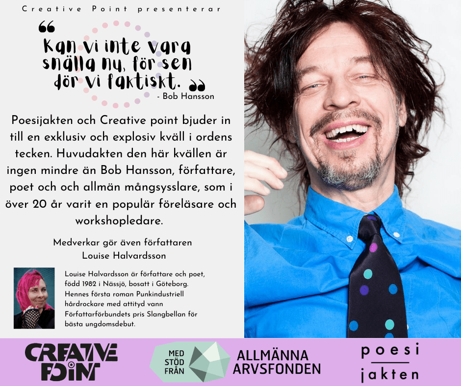Jag är inte med på Bokmässan i år, men jag är jätteglad över att vara med Bob Hansson på Brewhouse! Ett lajvstreamat event genom Creative Points och Poesijakten.
