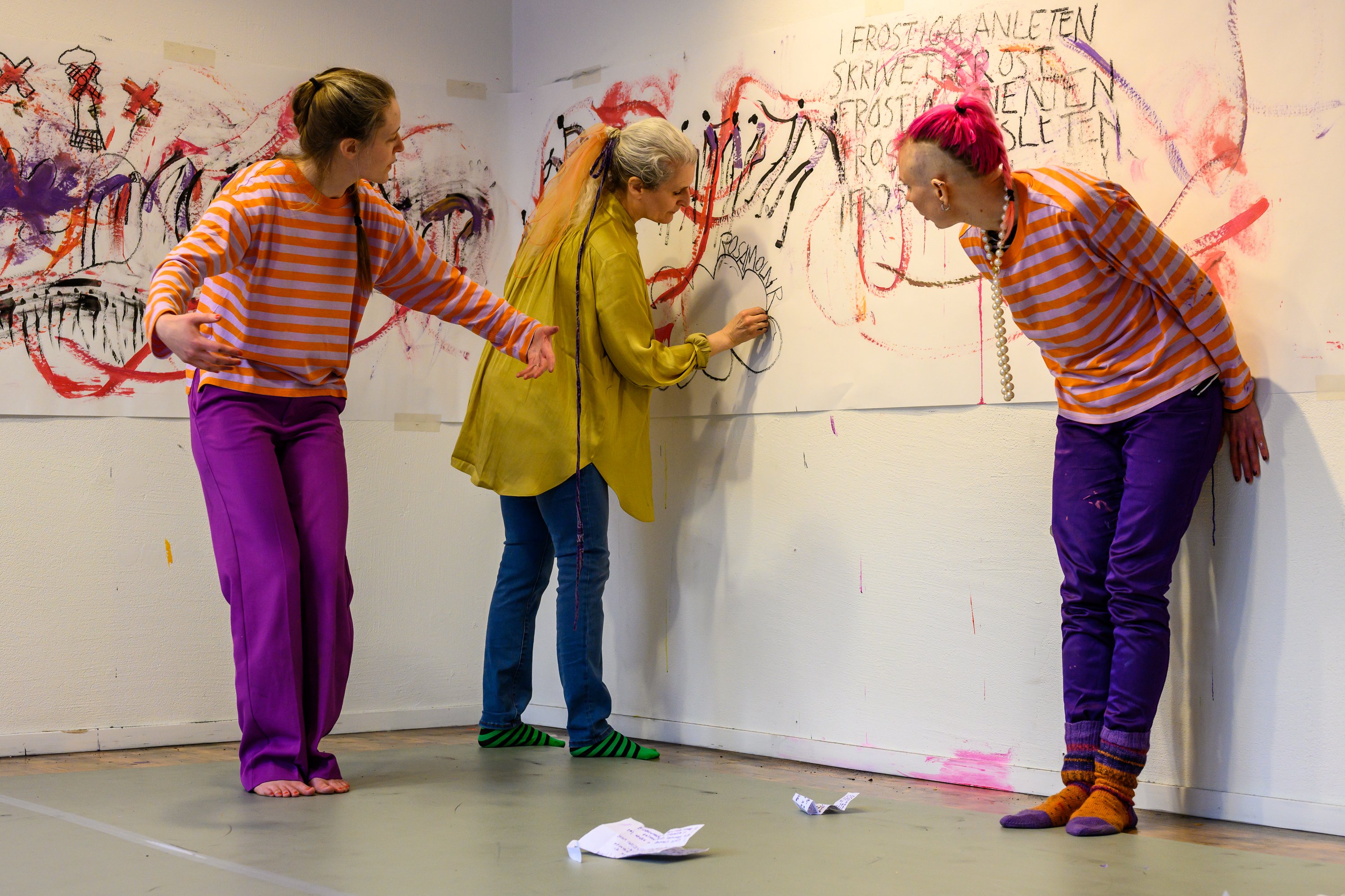 Helena Boström, bildkonstnär, bidrar med ’action-painting’. Längs väggarna runt rummet sätts en meter brett vitt papper upp och fylls efterhand – inspirerad av dansen och poesin – med figurer, symboler, tecken och bokstäver medan repetitioner och föreställningar pågår.