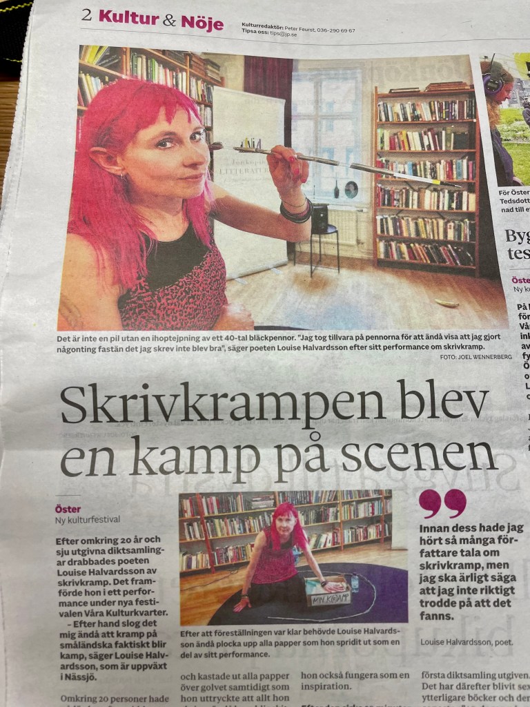 SKRIVK(R)AMP är ett pågående interaktivt performance-verk som blir olika varje gång det framförs. Louise Halvardsson utforskar sin skrivkramp och tillsammans med publiken utvecklar hon den till en skrivkamp.
